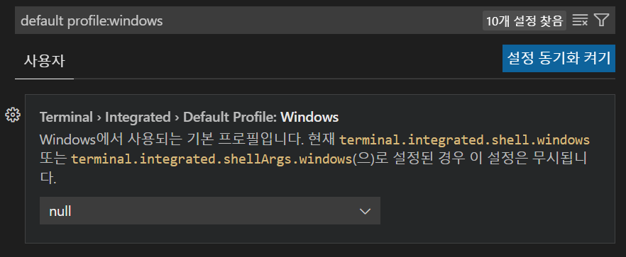- 여기서 null로 설정되어있을건데 해당 값을 원하는 터미널로 변경해주면 된다.