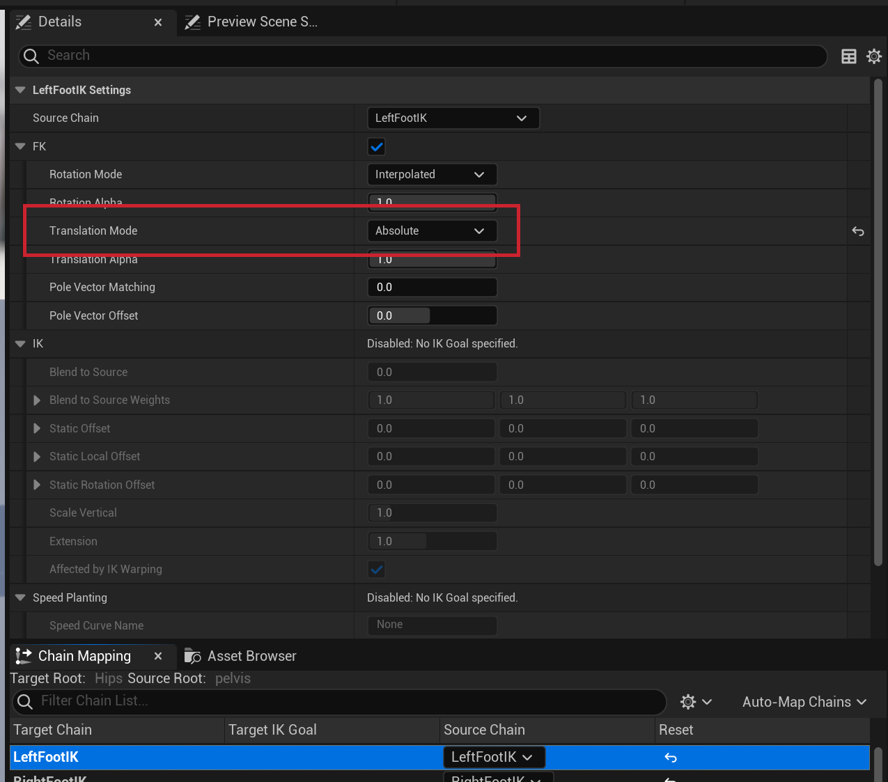 리타게터에서 소스체인 설정 후, 해당 타겟 체인을 클릭해서 디테일 창을 확인해보면 Translation Mode라는 항목이 존재하는데 해당 항목으로 Absolute로 설정해 준다.