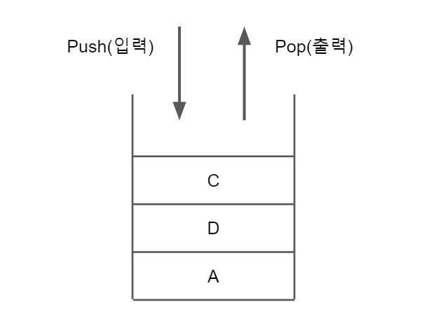 - 들어간 것이 먼저 나오는 후입선출(LIFO : Last In First Out)형식의 자료구조이다.