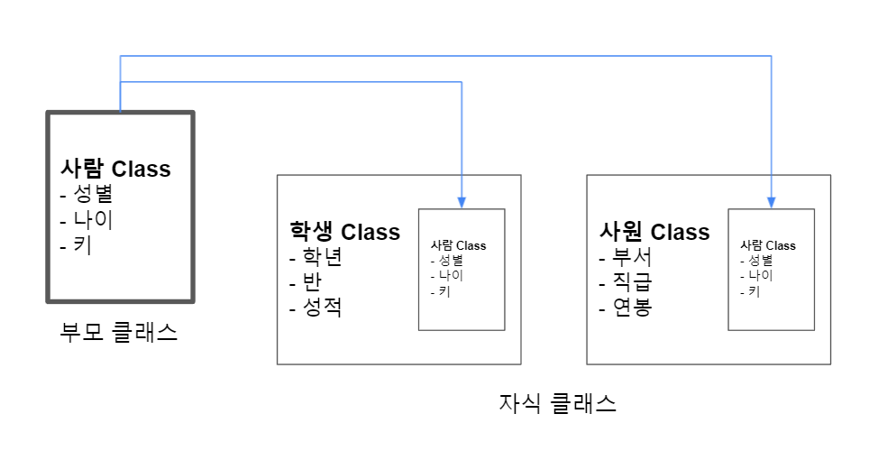 - IS-A((자식)은 (부모)이다) : Employee(자식 클래스)는 Person(부모 클래스)이다.