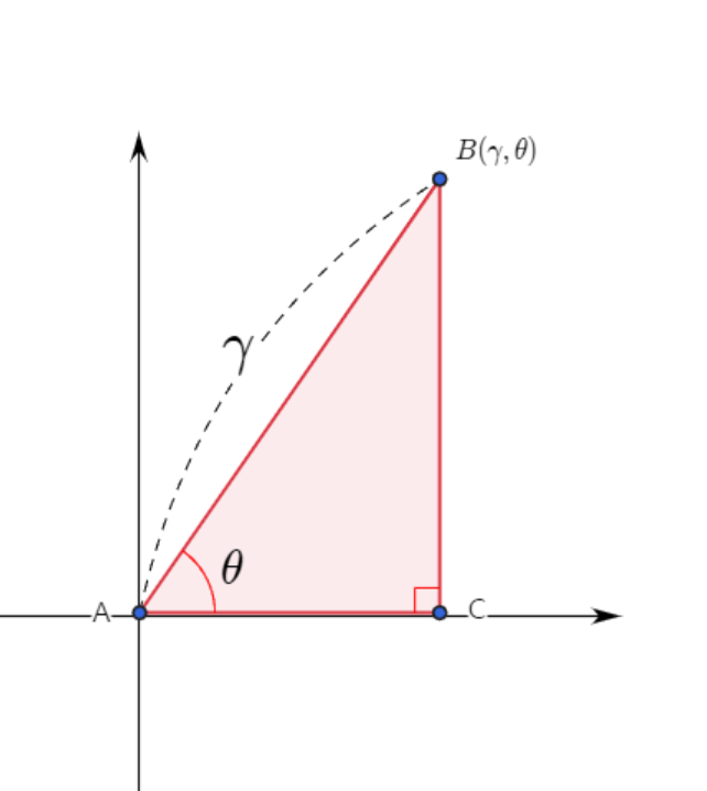 위 그림에 있는 B(r, θ)를 극좌표라고 하는데, 원점에서 떨어진 점 P가 있으면 P(r, θ)로 표시한다. (여기서 r은 극(원점)과 점 P를 잇는 직선의 길이, θ는 각 A를 말한다.)
