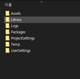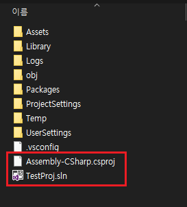 - 유니티 프로젝트 폴더를 열어보면 다음과 같이 유니티 프로젝트 관련 폴더만 보이고 비주얼스튜디오 관련 파일은 보이지 않는것을 확인할 수 있다. (비주얼 스튜디오의 솔루션 탐색기에서도 확인이 가능하다.)