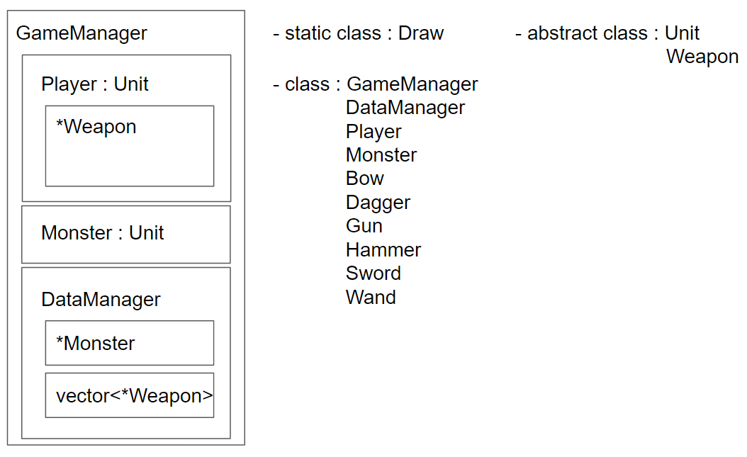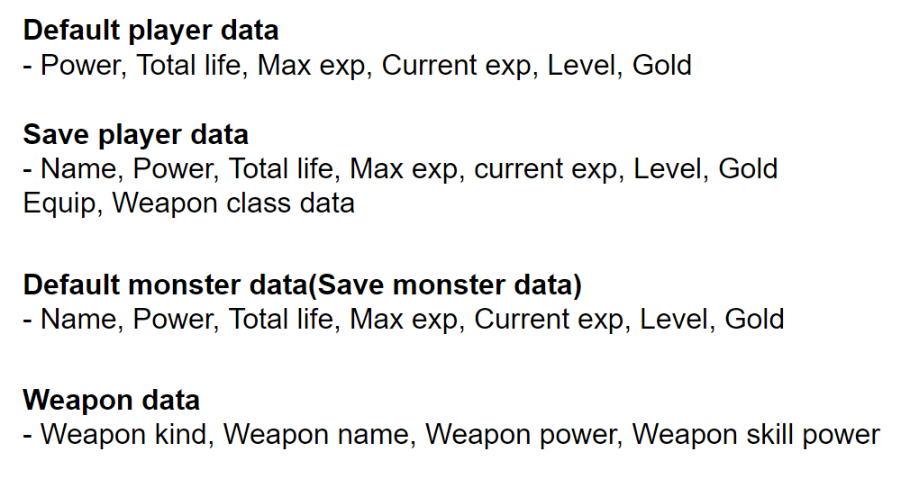 - Weapon, Player, Monster의 데이터 문자열, Monster 배열, Weapon 배열 벡터를 멤버로 가지고있다.