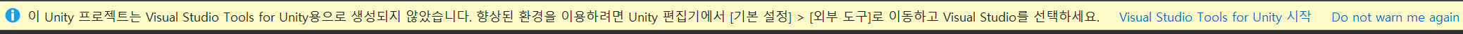 - 이 Unity 프로젝트는 Visual Studio Tools for Unity용으로 생성되지 않았습니다. 향상된 환경을 이용하려면 Unity 편집기에서 [기본설정] > [외부도구]로 이동하고 Visual Studio를 선택하세요.