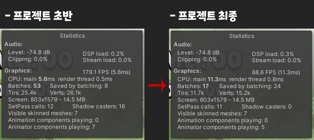 - 이번 프로젝트에서는 맵이 고정이 아닌 동적 오브젝트들이기 때문에 Dynamic batching을 사용해서 배칭처리를 했다.