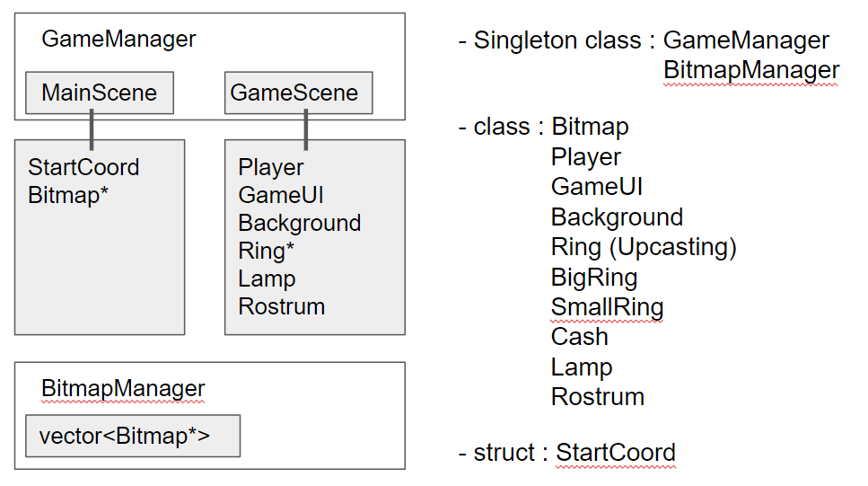 - 클래스 멤버는 MainScene, GameScene을 가지고 있고, 화면을 그리기 위한 HDC, HWND를 멤버로 가지고 있다.