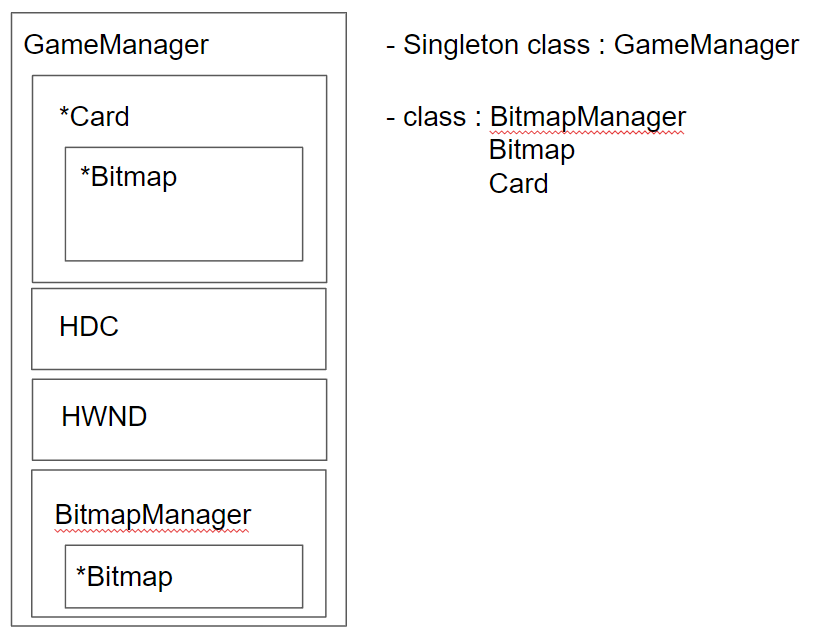 - 클래스 멤버는 BitmapManager, Card를 가지고 있고, 화면을 그리기 위한 HDC, HWND를 멤버로 가지고 있다.