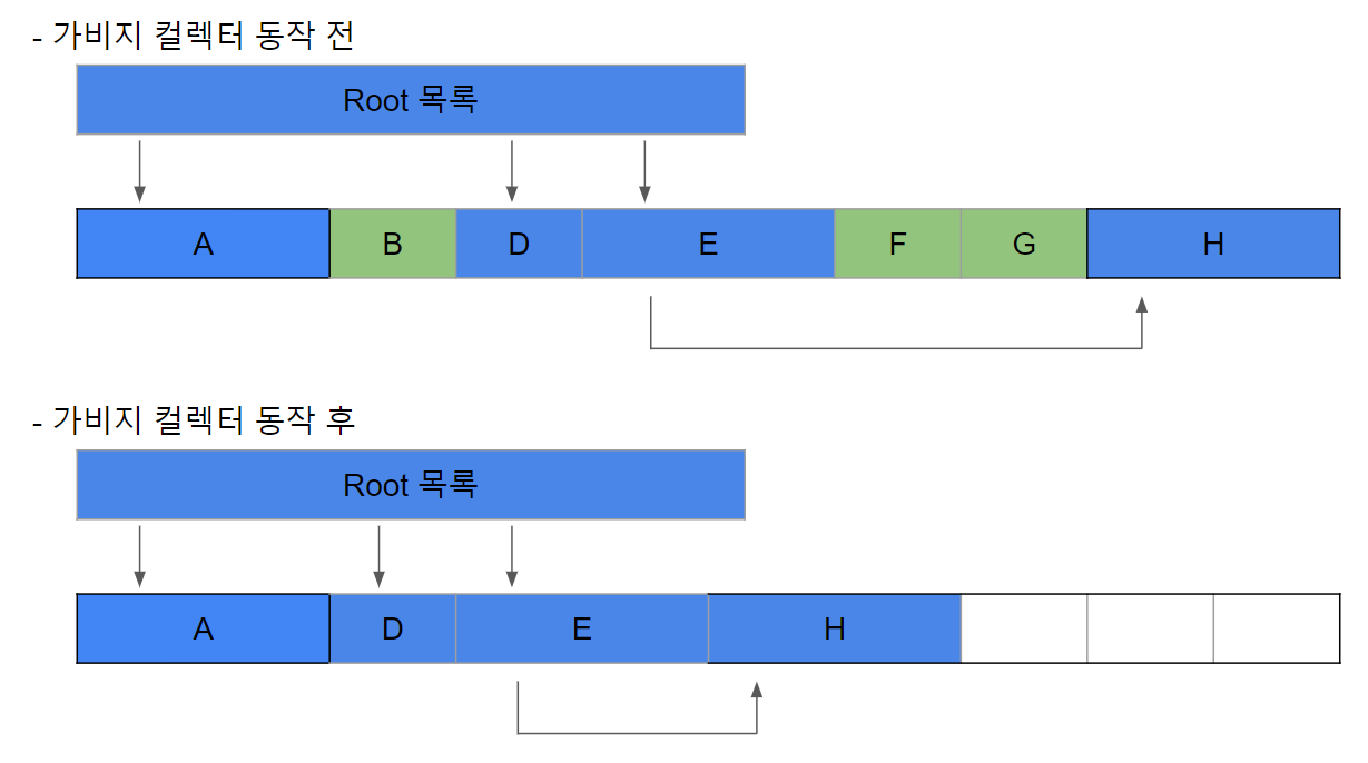 4. 루트 목록에 대한 조사가 끝나면, 가비지 컬렉터는 힙을 순회하면서 비어있는 공간에 쓰레기의 인접 객체들을 이동시켜서 채워넣는다.