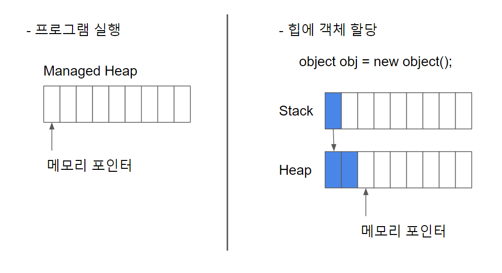 - C#으로 작성한 실행파일을 실행하면, CLR은 프로그램을 위한 일정 크기의 메모리(Managed Heap)를 마련한다.