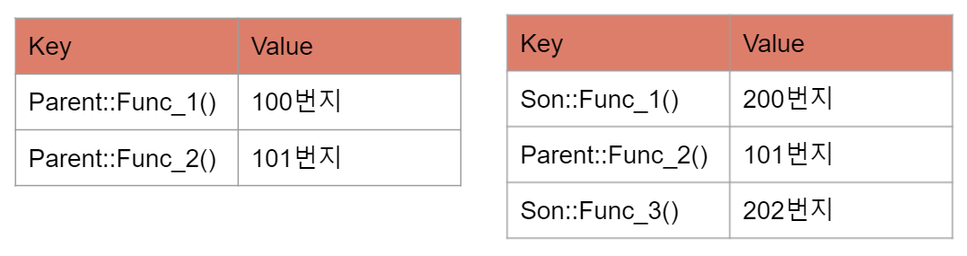 - 따라서, Parent 클래스와 Son의 클래스의 가상함수 테이블은 다음과 같이 구성된다.