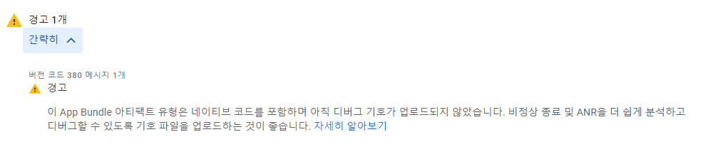 이 App Bundle 아티팩트 유형은 네이티브 코드를 포함하며 아직 디버그 기호가 업로드되지 않았습니다.